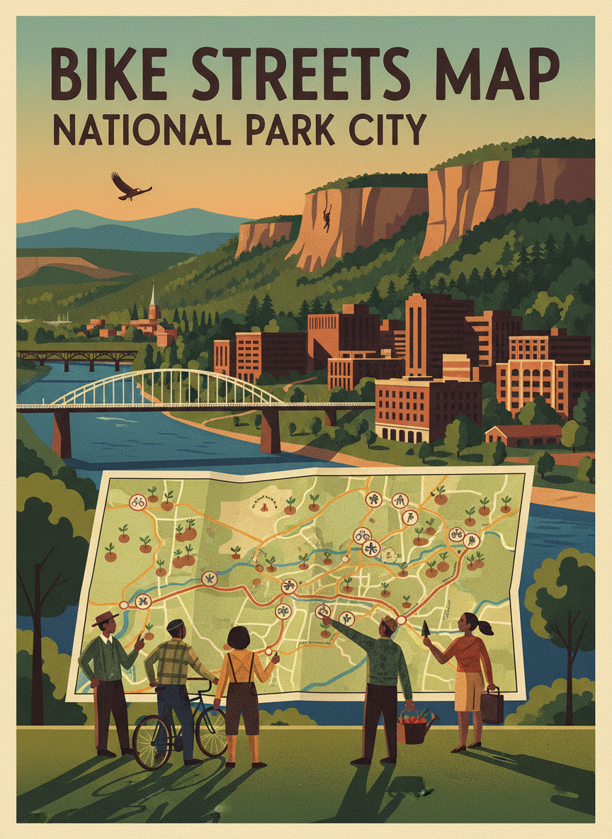 Create a printed and digital map linking Chattanooga's community gardens via low-traffic bike streets, helping gardeners, volunteers, and curious residents visit gardens by bike. The map would show garden locations, hours, what's growing, and the safest bike routes connecting them. Chattanooga has a growing network of community gardens but no resource connecting them to each other or to the cycling network. A bike-garden map would encourage cross-pollination between gardening and cycling communities, help new residents discover gardens near them, and promote car-free trips to gardens for drop-in volunteering and produce pickup.