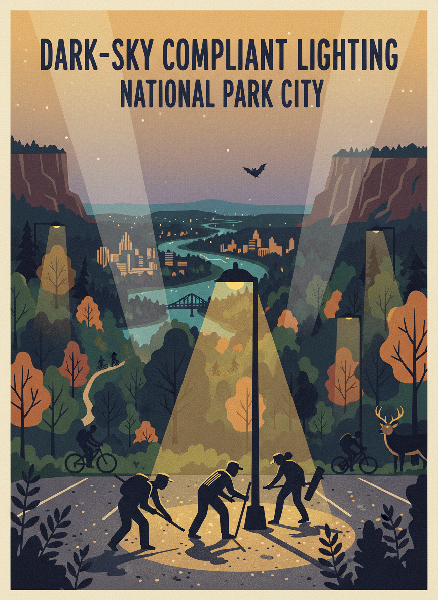 Replace existing parking lot lights at the Greenway Farms trailhead with dark-sky compliant fixtures that direct light downward, reducing light pollution that disrupts nocturnal wildlife along the North Chickamauga Greenway. The new fixtures would maintain safety while dramatically reducing sky glow. The Greenway Farms parking lot's current lights are unshielded, casting light horizontally and upward into the adjacent greenway corridor. This disrupts the feeding patterns of bats, confuses migratory birds, and wastes energy. Dark-sky compliant fixtures provide better ground-level illumination with 60% less energy use and near-zero upward light spill.